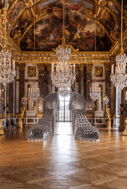 The giant stainless steel statement pieces reflects off of the mirrors, and creates the feeling that the spirits of the women of Versailles are filling the palace with their presence.