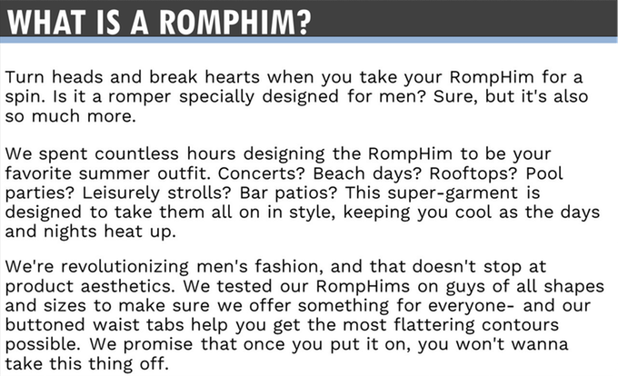 Upon reading about this new fashion item, designed by bros, for bros, I was once again struck by how fragile masculinity is. That you would need to call a garment that already exists (fashion magazines have been touting rompers to women for years) by a name that emphasises that it is for men is fascinating. While I am in no position to judge what people wear, I do strongly feel that I wouldn’t be able to stay friends with anyone who used the word “romphim” seriously.